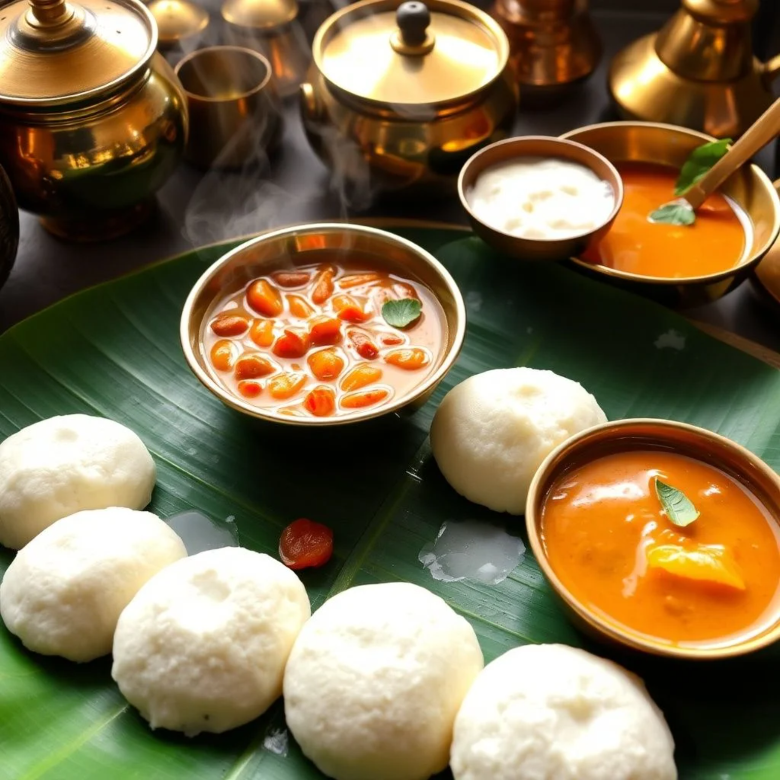 El vapor se eleva como nubes matutinas desde la vaporera de bambú, llevando consigo el aroma delicado y terroso de la masa fermentada de lenteja negra y arroz. Es un perfume que susurra promesas de confort: suave, ligeramente ácido, con esa nota distintiva que solo la fermentación natural puede crear. Mientras tanto, en la olla de barro vecina, el sambar borbotea suavemente, liberando una sinfonía aromática donde el tamarindo agrio danza con las especias tostadas y el jaggery dulce. Este es el momento mágico del amanecer en Tamil Nadu, cuando el hogar se llena de los aromas que han despertado a generaciones enteras durante más de mil años.